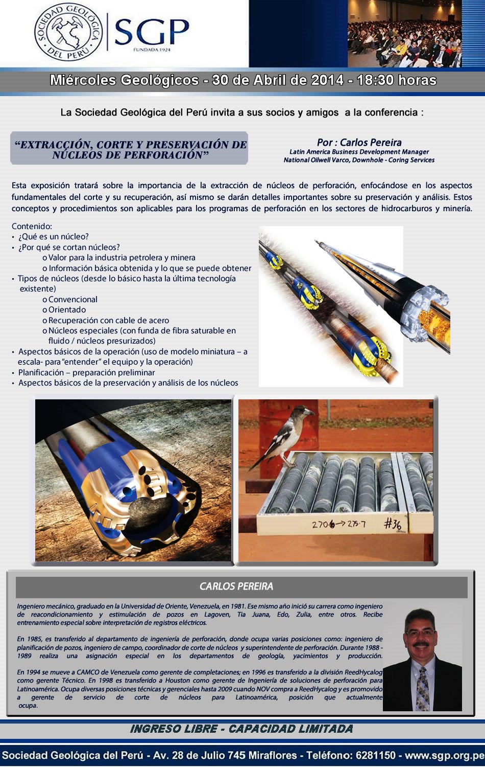 Estimados socios y amigos loes invitamos a participar de nuestro acostumbrado miércoles geológicos, este miércoles 30.04.14,  tendremos la ponencia del Ing. Carlos Pereira con el tema “EXTRACCIÓN, CORTE Y PRESERVACIÓN DE NÚCLEOS DE PERFORACIÓN”