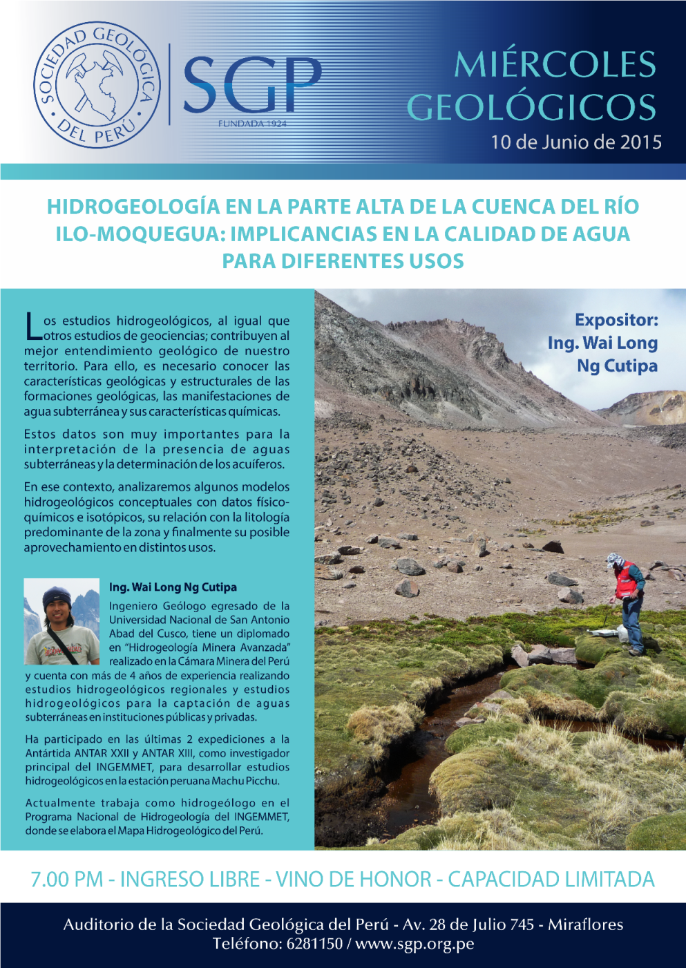Miércoles Geológico: “HIDROGEOLOGÍA EN LA PARTE ALTA DE LA CUENCA DEL RÍO ILO-MOQUEGUA: IMPLICANCIAS EN LA CALIDAD DE AGUA PARA DIFERENTES USOS