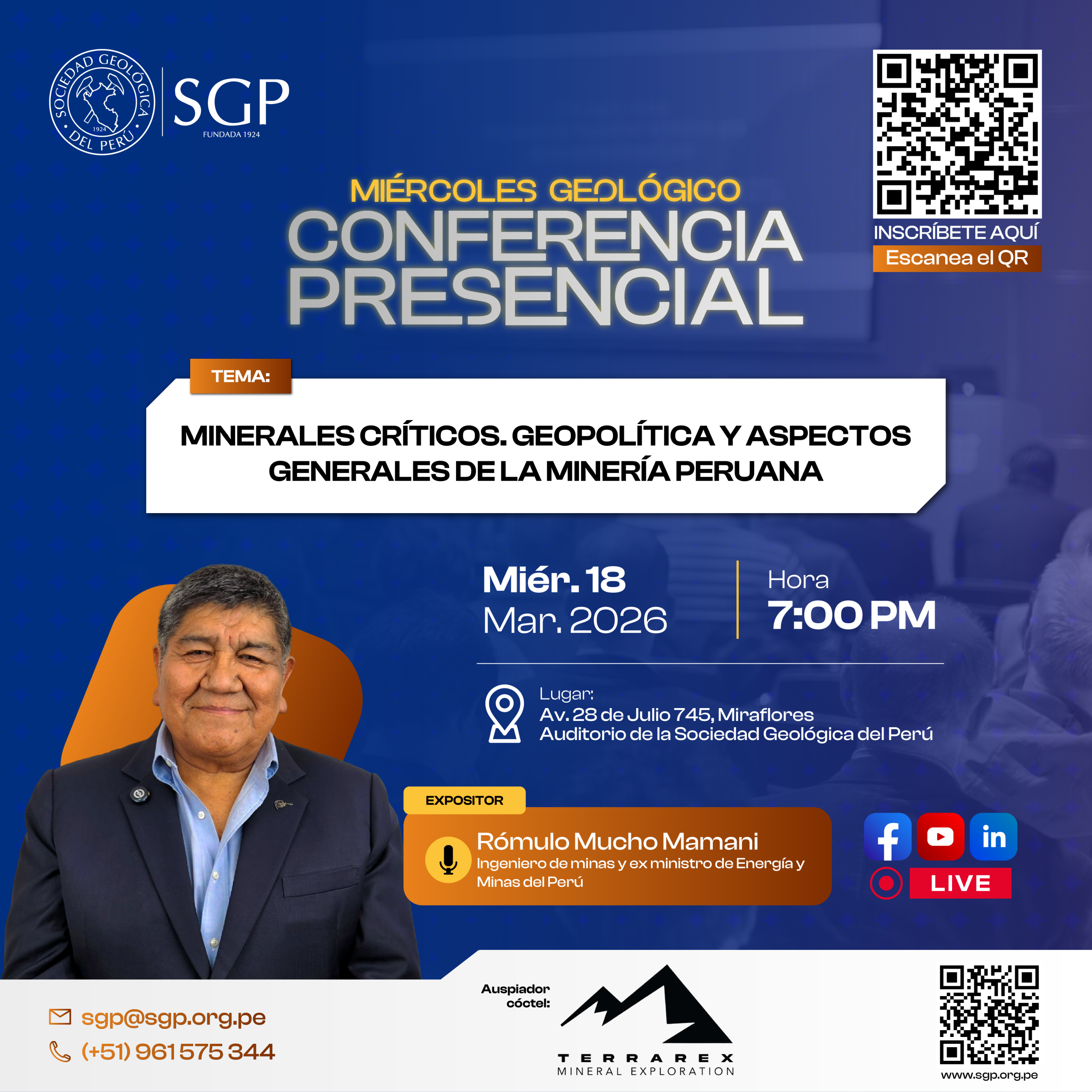 Miércoles Geológico, 18 de marzo 2026 7:00 PM | “Minerales críticos. Geopolítica y aspectos generales de la minería peruana”.